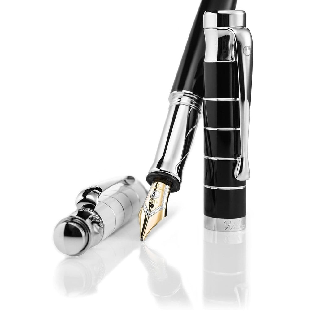 Die schwarze Farbe, platinierte Zierelemente und eine 18 Karat Goldfeder sind Hauptmerkmale des Waldmann Tango Füllers.
