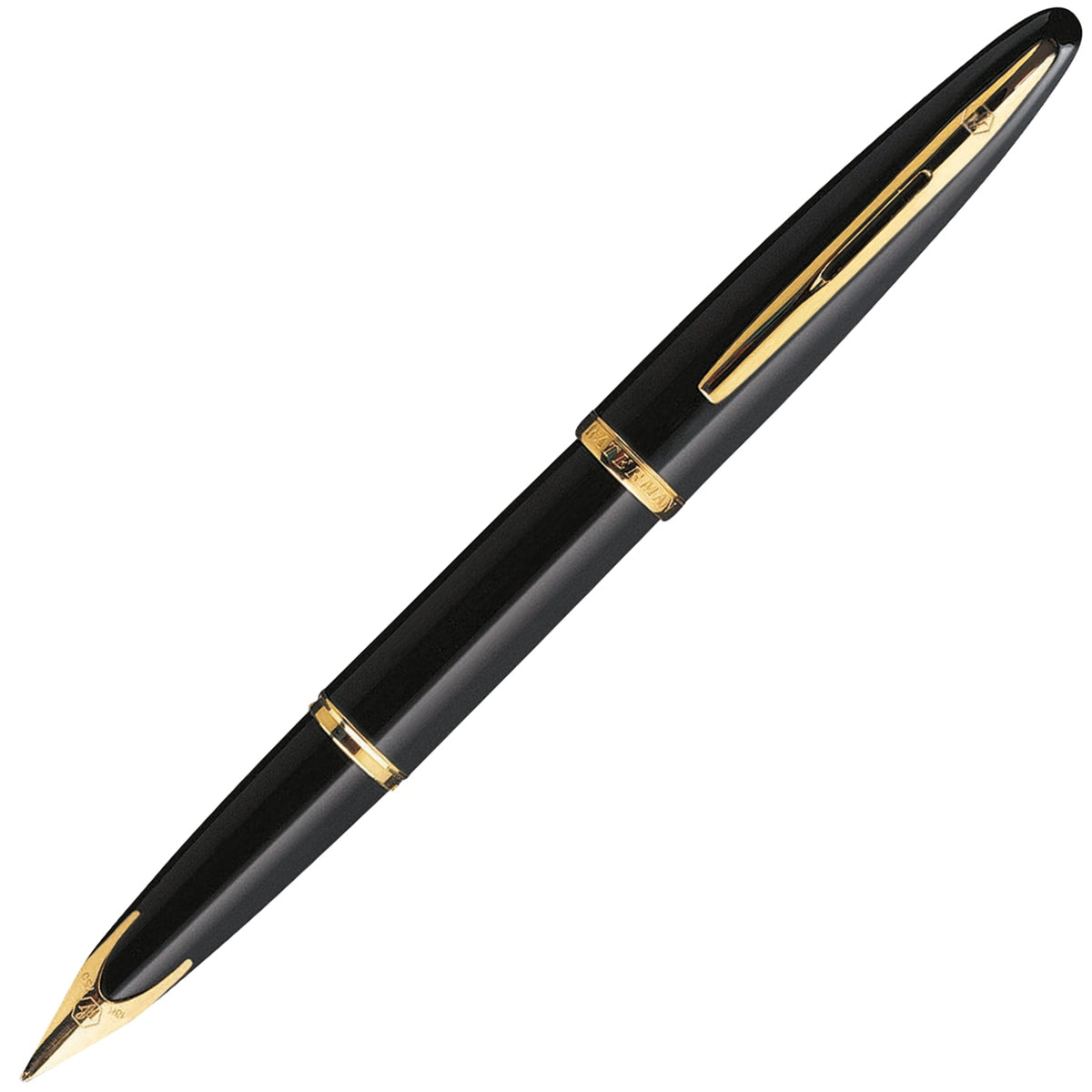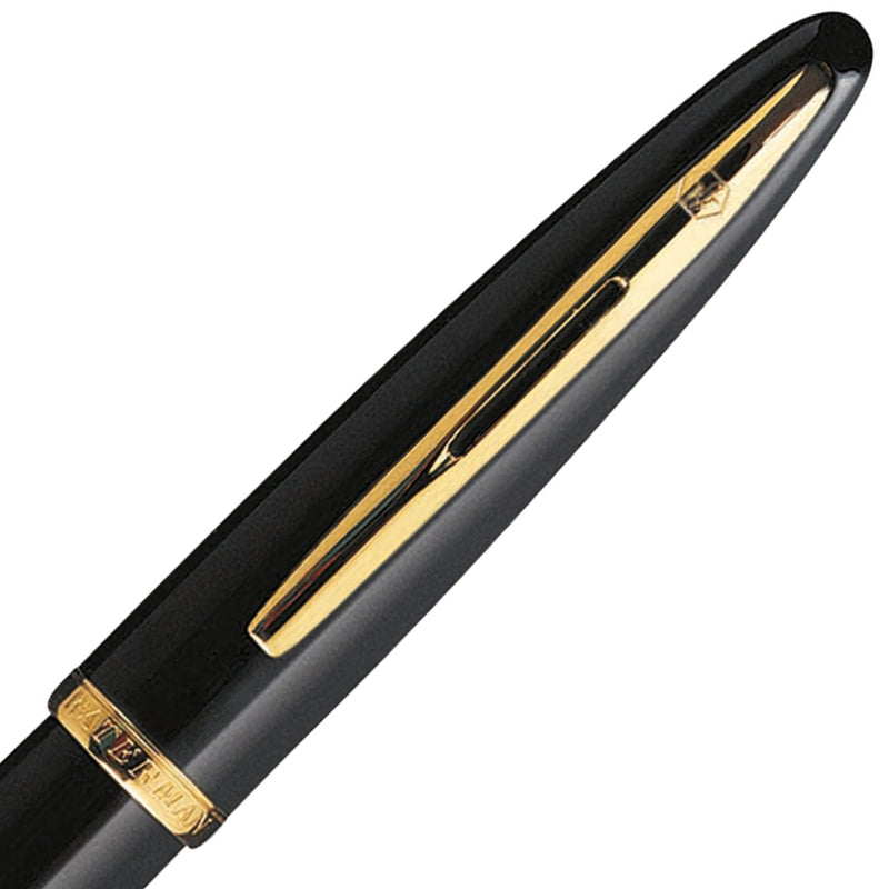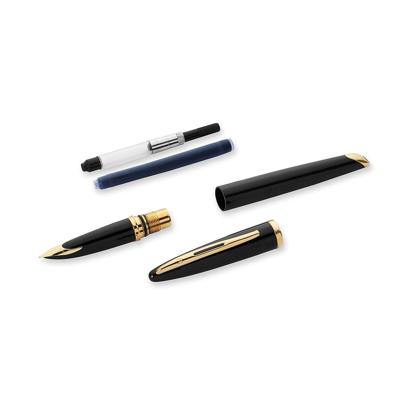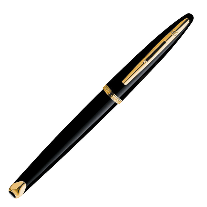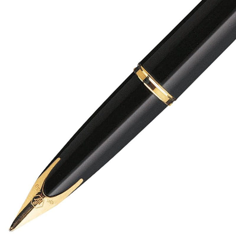Der Waterman Carène Füllhalter in schwarz hat goldene Zierelemente und ein klassisches Design.